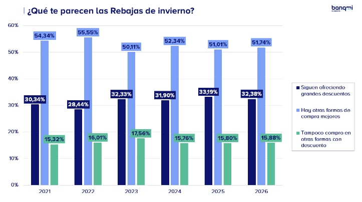 El mayor gasto en rebajas por parte de los ciudadanos no se traduce en una mejor valoración de ellas. Según datos de percepción recopilados por Banqmi, la confianza en el descuento tradicional sigue siendo limitada. En 2026, solo el 32,38% de los consumidores considera estas rebajas siguen ofreciendo grandes descuentos, una cifra incluso más baja que la de 2025, que se situó en el 33,19%, y que evidencia que ni uno de cada tres asocia hoy este periodo de descuentos con un ahorro significativo.