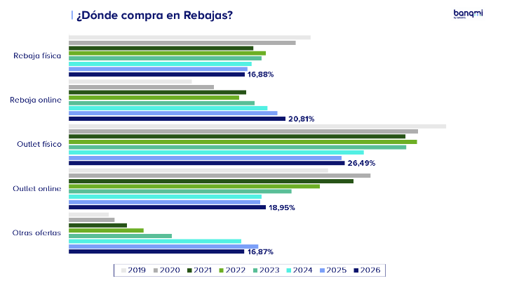 Así, aunque el comercio físico sigue perdiendo protagonismo en términos generales, no todos los formatos evolucionan de la misma manera. Por un lado, el outlet físico es elegido estas rebajas por el 26,49% de los consumidores como su lugar de compra preferido, registrando un ligero repunte respecto a 2025 (26,21%), aunque todavía lejos de los niveles superiores al 30% alcanzados entre 2019 y 2023.