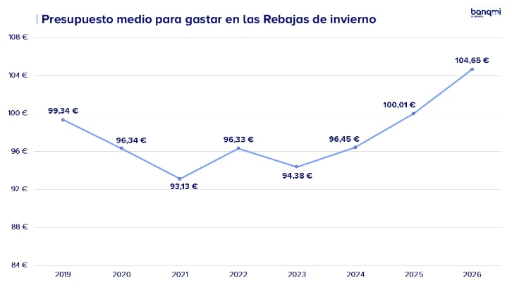Así lo refleja la última encuesta elaborada por el comparador financiero Banqmi, que sitúa el gasto medio en rebajas este invierno en 104,65 euros por persona, frente a los 100,01 euros registrados en 2025. El incremento, de 4,64 euros, supone una subida del 4,64% interanual y convierte a 2026 en el año con mayor gasto medio previsto, superando incluso los niveles previos a la pandemia.