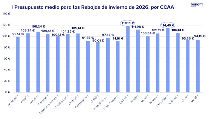 En términos de presupuesto medio absoluto, destacan La Rioja (118,13 euros por persona) y la Comunidad de Madrid (111,98 euros de media por persona) como las autonomías con mayor gasto previsto estas rebajas. A continuación se sitúan el País Vasco (114,45 euros) y, como se ha señalado, la Comunidad Valenciana (106,14 euros).